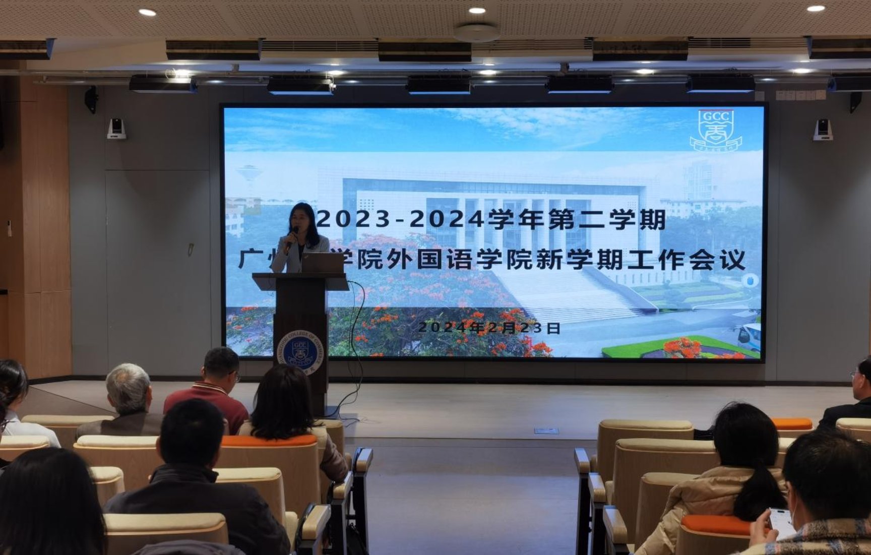 2月23日下午,外国语学院于第八教学楼204召开2023-2024学年第二学期新学期学院工作会议,学院全体教职工参加会议,会议由学院院长郭遂红主持。
