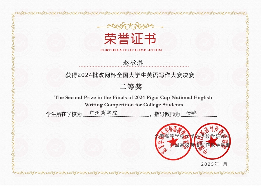近日,2024年“批改网杯”全国大学生英语写作大赛决赛圆满落下帷幕。经过激烈的竞争,我校学子在本次大赛中获得二等奖3项和三等奖7项的优异成绩。外国语学院范俊英、郭伊芸、潘文晗、李琦、吴艾琪、杨鹂、张珊和朱兴言等老师荣获“优秀指导老师”称号。