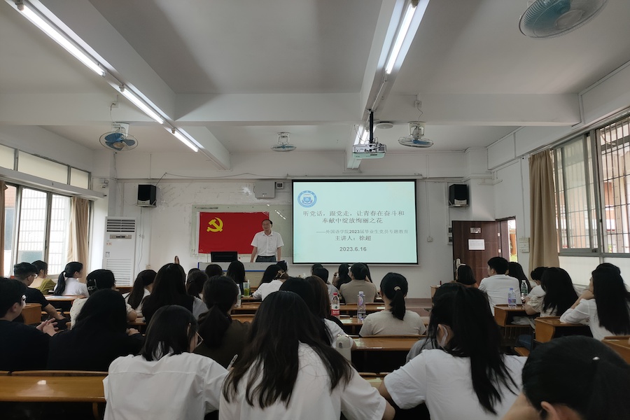 为深入学习贯彻习近平新时代中国特色社会主义思想,切实增强毕业生党员的政治意识、大局意识、核心意识、看齐意识,引导毕业生党员坚定理想信念,发挥模范带头作用,外国语学院于6月16日下午在第三教学楼104教室举行2023届毕业生党员教育大会。外国语学院党总支书记徐超出席并为毕业生党员带来了一堂以“不负时代,不负韶华,让青春在奋斗和奉献中绽放绚丽之花”为主题的党课。