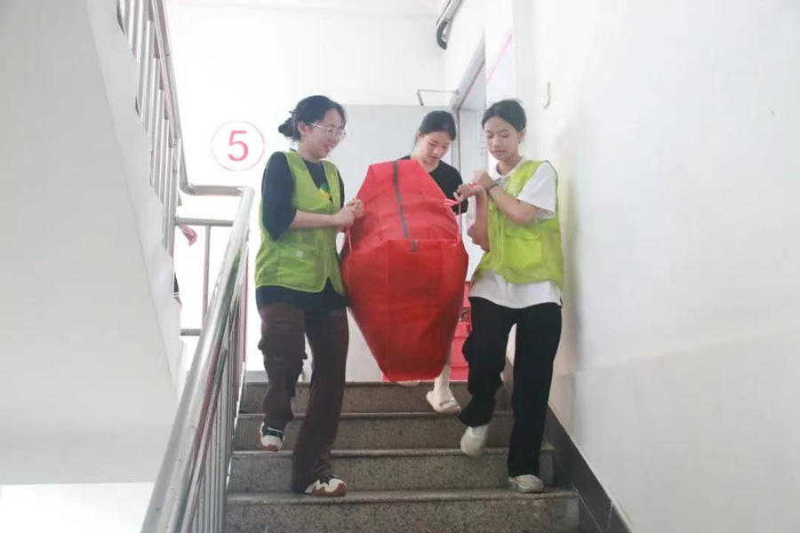在外国语学院团委实践部的引领下,志愿者们分工明确,很快工作便进入正轨,为活动的顺利开展奠定基础。楼梯间、校道里,他们的身影无处不见,热烈的阳光打在志愿者们的身上,汗水浸湿了他们的衣裳,但他们匆忙的脚步从未改变。志愿者们脸上洋溢着的是对毕业生们的真切祝福,手中承载着的是毕业生们四年的青春。