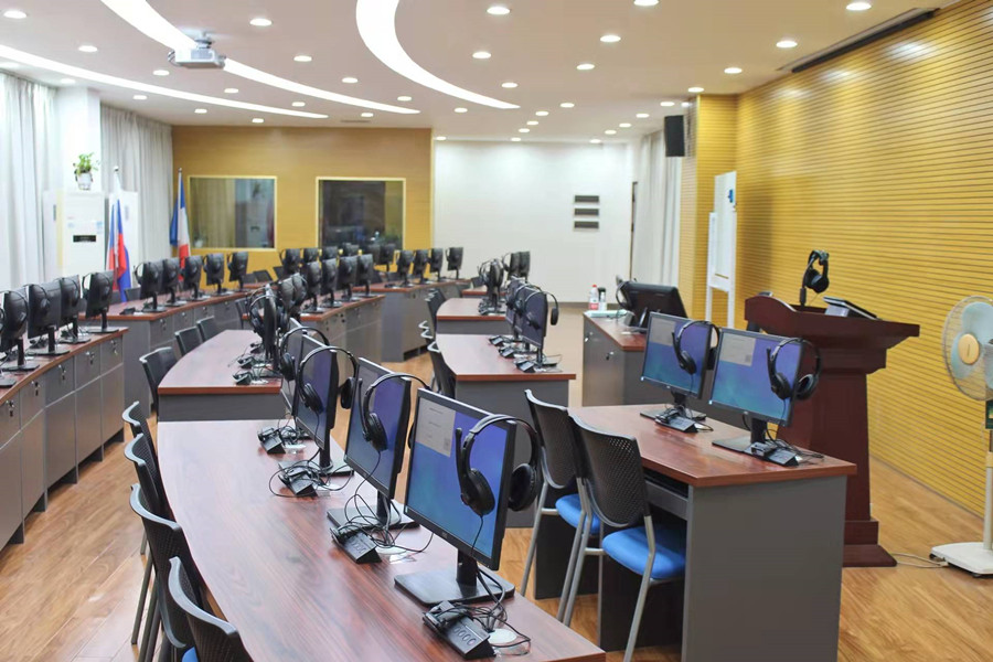 外国语学院有多媒体教室 48间、语音实验室8间、口笔译实训室1间、商务外语沟通情景室1间、日语文化田野室1间、德语文化情景室1间、微格教学实训室1间、多功能录播室1间,还与其他学院共享跨境电商实训室、新媒体实训室等。为保证学生能进行在线外语练习,外国语学院购买了“传神翻译实训系统”“科大讯飞Fif口语训练系统”,同时使用“外研社U校园”“外教社WE learn 随行课堂”“MyET日语课程”“Speexx德语训练平台”等多个线上外语资源和能力训练平台,辅助外语技能训练。