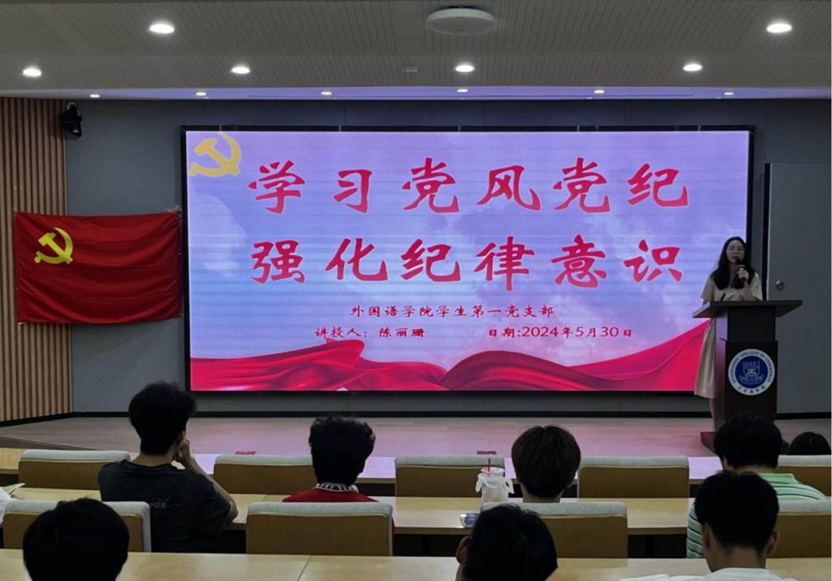 为认真贯彻落实习近平总书记关于党纪学习教育的重要讲话和重要指示精神,外国语学院学生第一党支部于5月30日下午在第八教学楼101举办“学习党风党纪,强化纪律意识”主题党课。本次主题党课由外国语学院学生第一党支部书记陈丽珊授课,全体入党申请人出席。