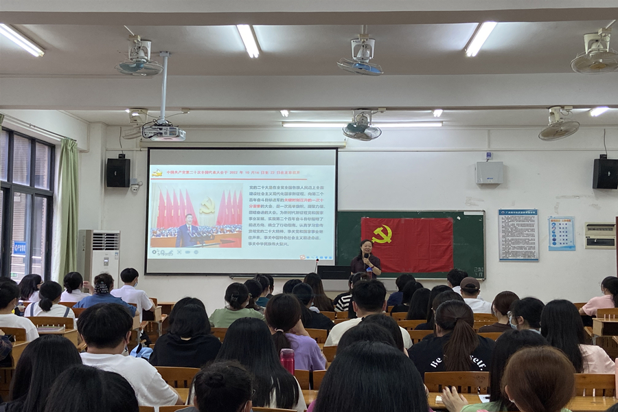 为深入学习宣传贯彻党的二十大精神,扎实推进学习贯彻习近平新时代中国特色社会主义思想主题教育走实走深,5月19日下午,外国语学院党总支在四教209教室组织召开学习宣传贯彻党的二十大精神理论宣讲会。广州商学院党的二十大精神理论宣讲团成员之一、马克思主义学院荣誉院长巴莎教授以《全面建设社会主义现代化国家的政治宣言和行动纲领》为题,对党的二十大报告进行了详细解读。外国语学院党总支组织委员谢清玲主持会议,外国语学院全体学生党员、2023年上半年发展对象培训班学员及部分入党积极分子代表约140人参会。